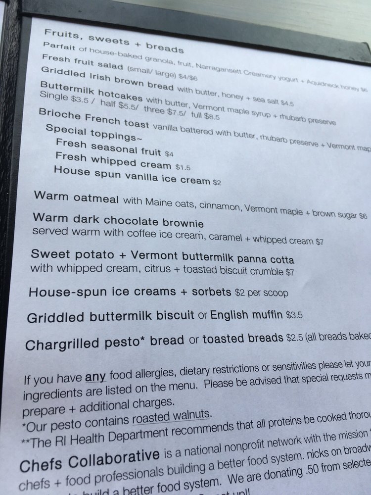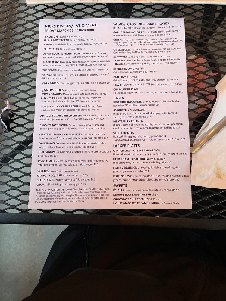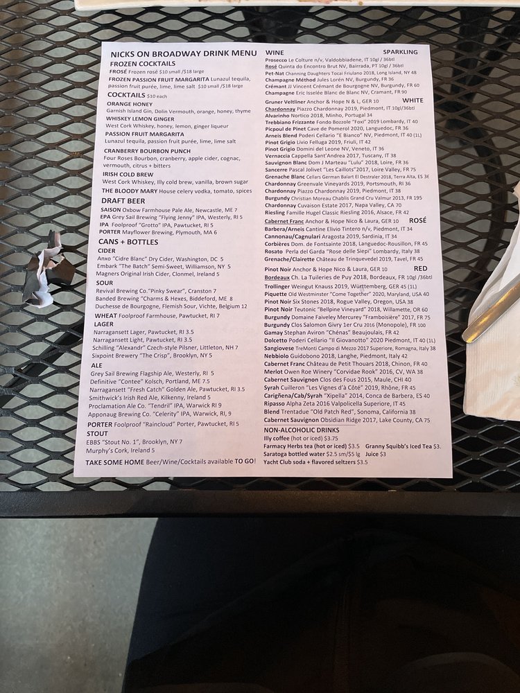 Nicks On Broadway, located in Providence, RI, offers a diverse menu of New American cuisine with a touch of elegance. From starters like the Soup Of Roasted Schartner Farm Tomatoes to main courses like Chargrilled Hereford Beef Sirloin, each dish is crafted with care and precision. The restaurant provides a trendy atmosphere with options for outdoor seating and a full bar. Customers rave about the friendly staff, fresh ingredients, and creative flavors. The Eggs Benny and sweet potatoes have been highlighted as standout dishes, showcasing the attention to detail in every bite. Whether it's brunch or dinner, Nicks On Broadway promises a memorable dining experience for food enthusiasts seeking quality and sophistication.